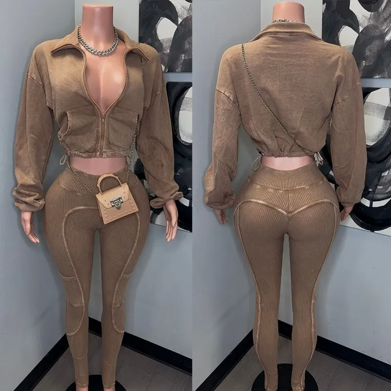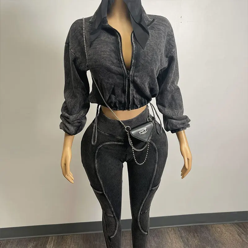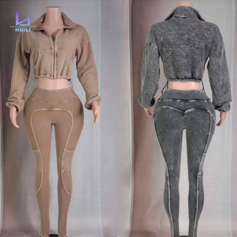 Huili Acid Washed Zip Up Crop Top & Rib Legging Matching Sets Custom Logo 2 Piece Slimming Yoga Running Ribbed Women's Sets 2025
